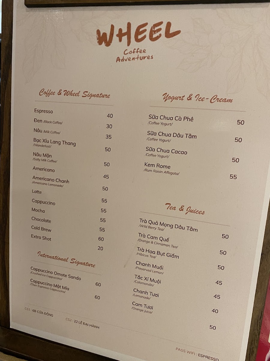 Welcome to Wheel Coffee, a charming café located in the heart of Hanoi at 6b P. Cửa Đông, Hàng Bồ, Hoàn Kiếm. This cozy spot has quickly become a favorite among locals and visitors alike, known for its rich selection of coffee that captures the essence of Vietnamese brews.